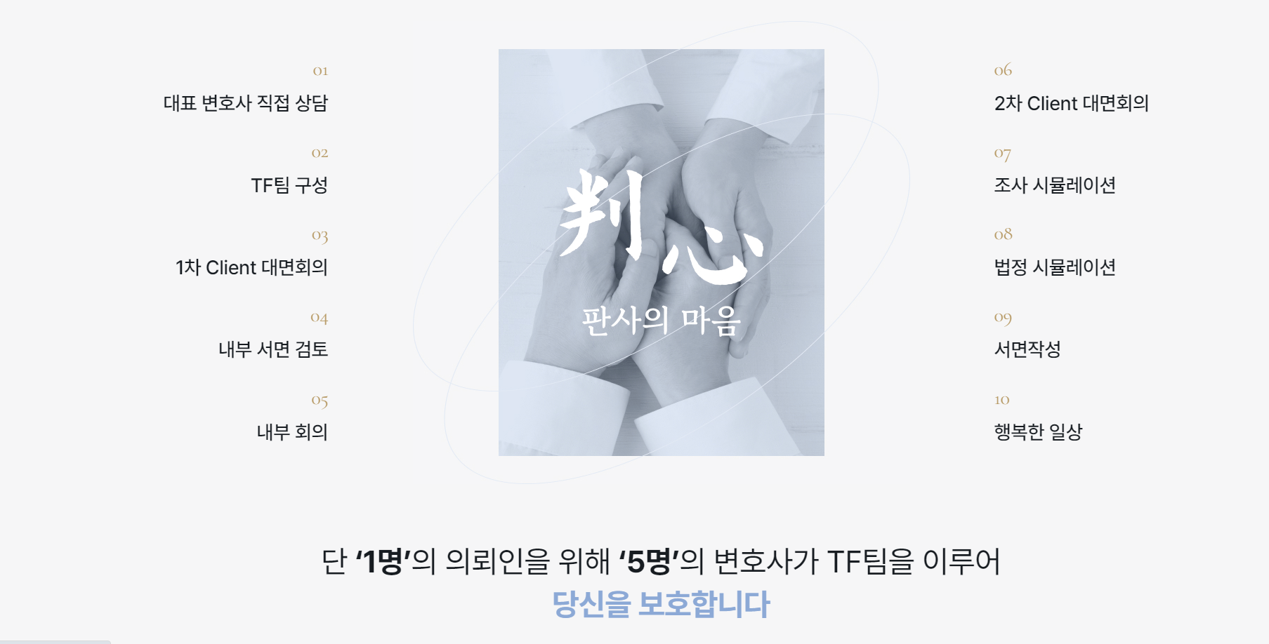 판심 법무법인은 단 ‘1명의 의뢰인’을 위해 ‘5명의 변호사’가 TF팀을 구성하여
